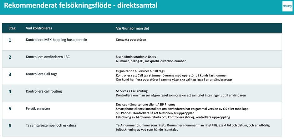 Om en kund inkommer och säger att inkommande eller utgående samtal inte fungerar – följ dessa steg för att kontrollera att användaren är korrekt upplagd innan ärendet går vidare till 2nd-line eller Drift.