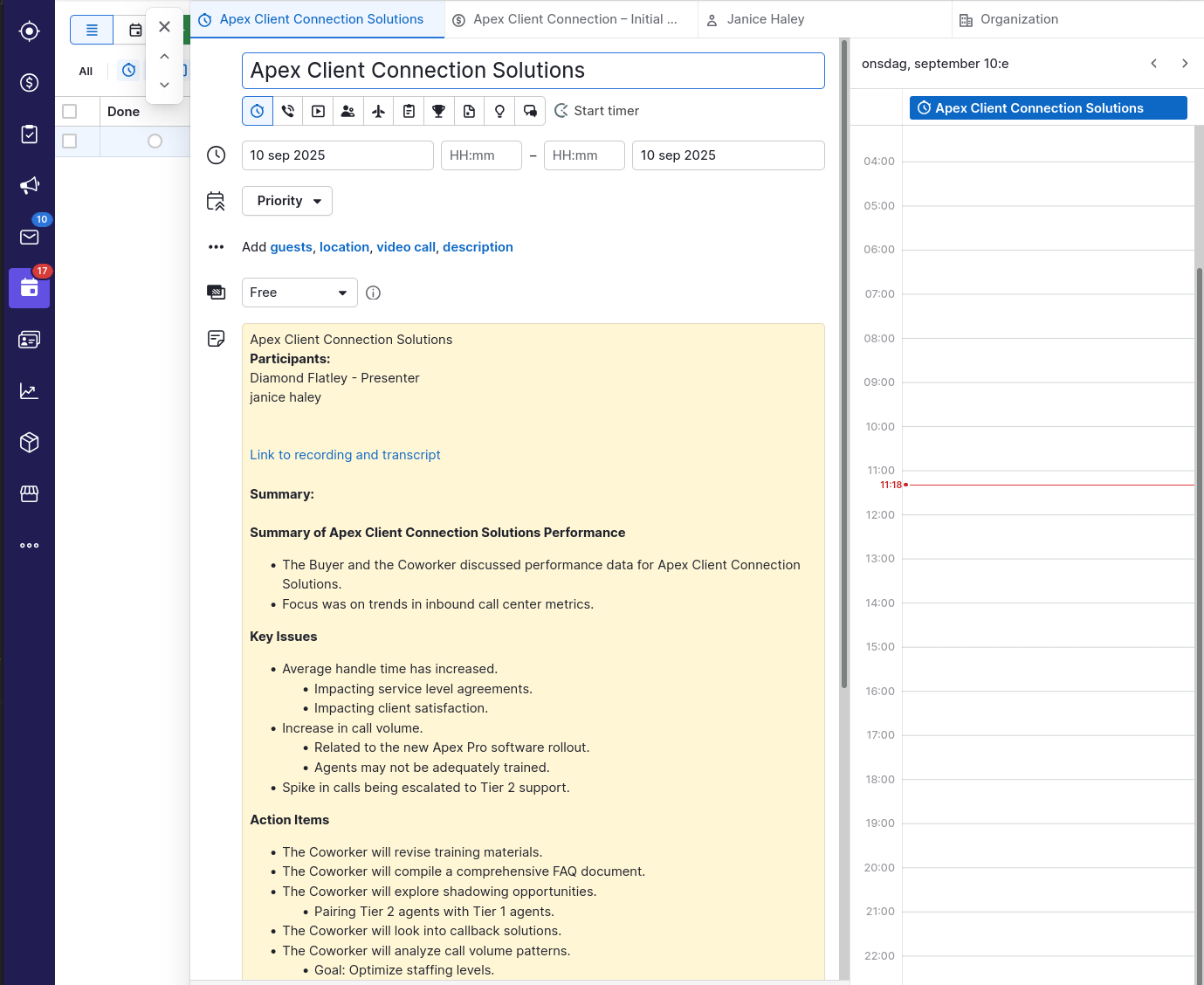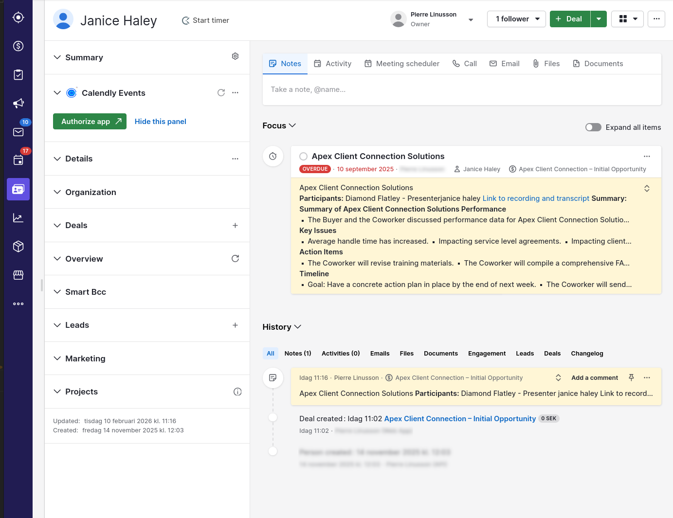 - Data Sovereignty: Pipedrive only receives the summary text and a link back to DCI. Your actual meeting recordings and transcripts stay securely stored in Dstny Conversational Intelligence and are never sent to Pipedrive.