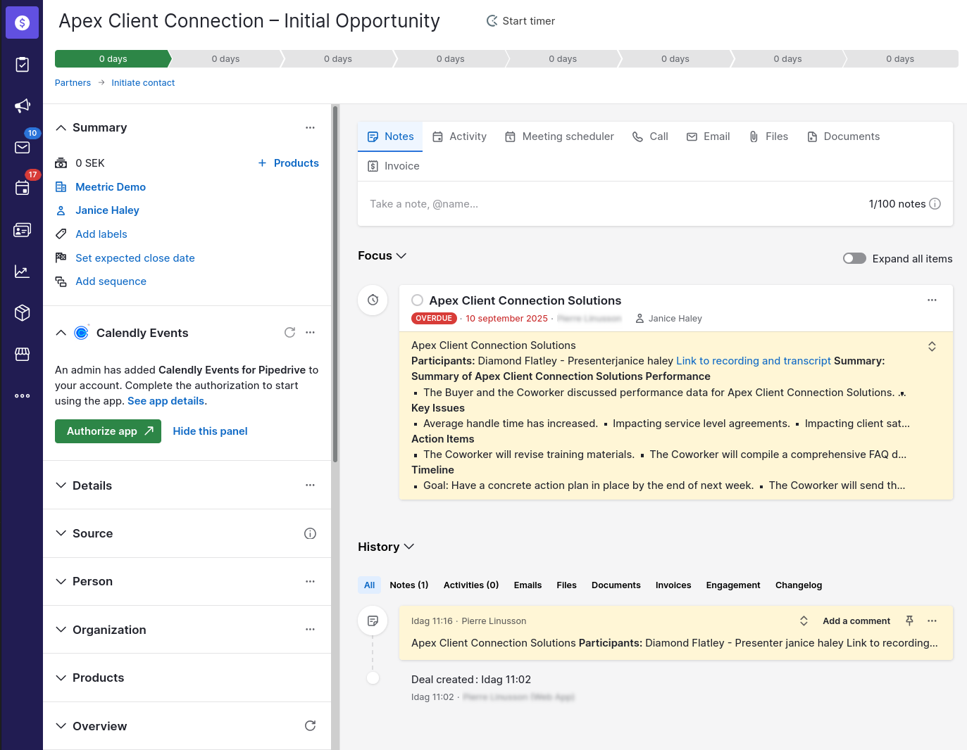 - If the meeting is already connected to a Pipedrive deal within DCI, the note is linked directly to that deal. Otherwise, DCI attempts to link to the person's most recently created deal.