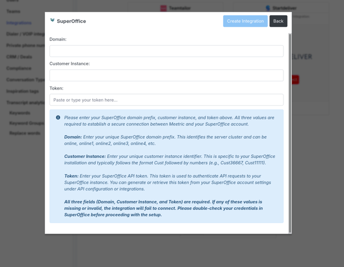 - Get your SuperOffice Credentials: Obtain your Domain prefix, Customer instance identifier, and API Token key from your SuperOffice environment.